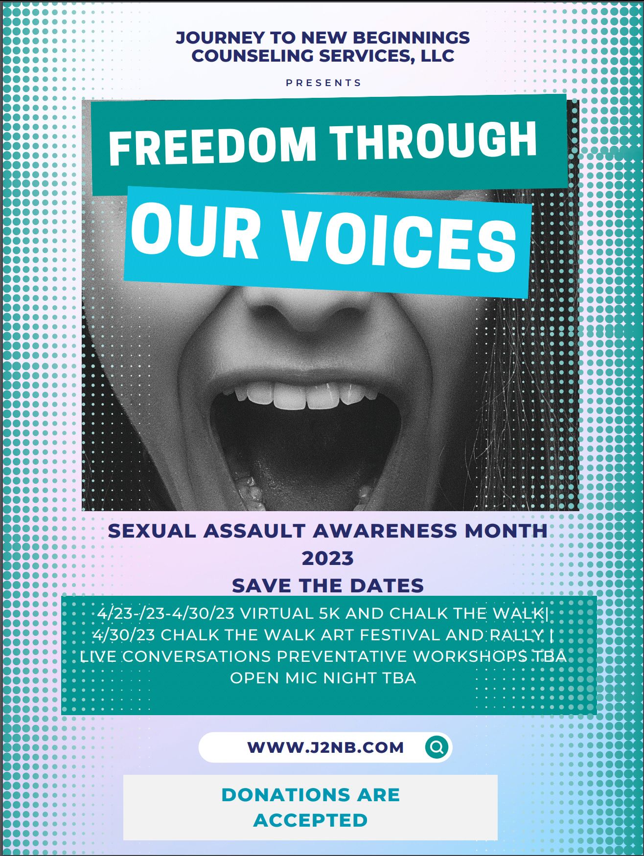 Each April, Journey to New Beginnings hosts a two-day retreat filled with restorative workshops, consent education, mindful movement, and survivor panels. The retreat is open to survivors, partners, clinicians, and supportive community members.